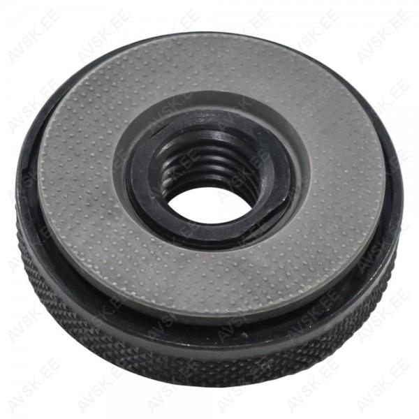 Universaalne M14 lukustusmutter nurklihvijale. Sobib 230 V. akuga. suruõhu nurklihvijatele. mille kinnitusvõlli keere on M14 (tavaliselt 115-125-150-230 mm ketaste kinnitamiseks). Mutril rihveldus s.t saab käega avada ja pole vaja spetsiaalvõtit.