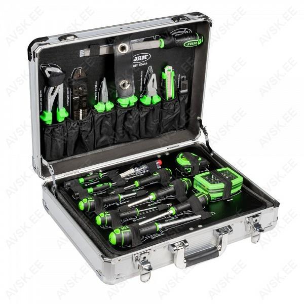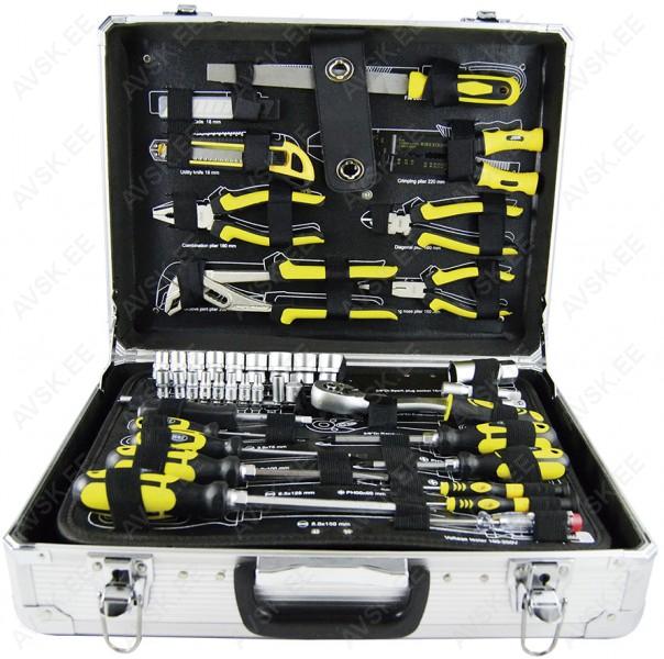 Alumiiniumraamiga kohvris tööriistakomplekt koju. suvilasse. autosse jne. Kasutamiseks lihtsamate tööde teostamisel (tehnika. mööbel. ehitus). Katab baastööde vajadused.