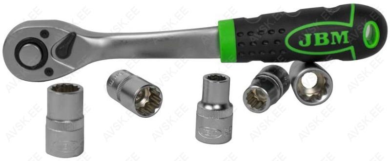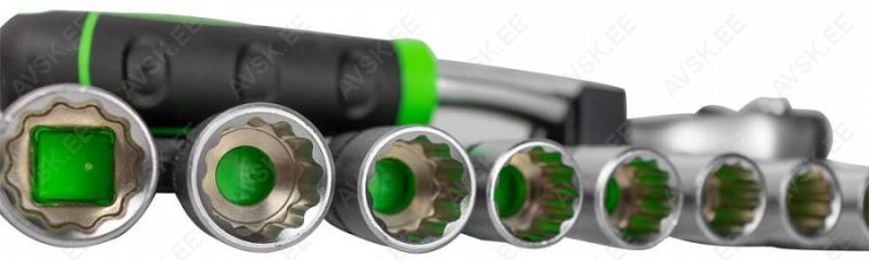 Hea komplekt. sisaldades kõik põhilised padrunimõõdud. 12-kant profiiliga padrunid. 72H tirrvõti. komposiitkäepidemega. Plasthoidikus.