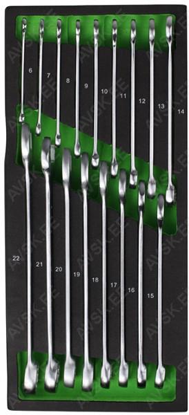 Pehmes PU-paneelis silmus-lehtvõtmed. Soovi korral saab kasutada tööriistakäru sahtlis. töölaua sahtlis. tööriistakotis või tööriistakohvris. Foam-paneeli mõõdud 175x380 mm. paksus 30 mm.