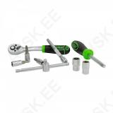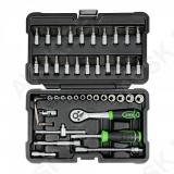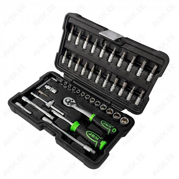Korralik 1/4" padrunite ja padrunotsikute komplekt. Võrreldes paljude teiste tootjatega. sisaldab JBM komplekt ka padrunite keeramise T-võtit. Tirrvõti 72H on offset-komposiitkäepidemega. mis kergendab selle kasutamist. CrV eriteras. Matt pinnatöötlus. Uue põlvkonna tugevas plastkohvris.