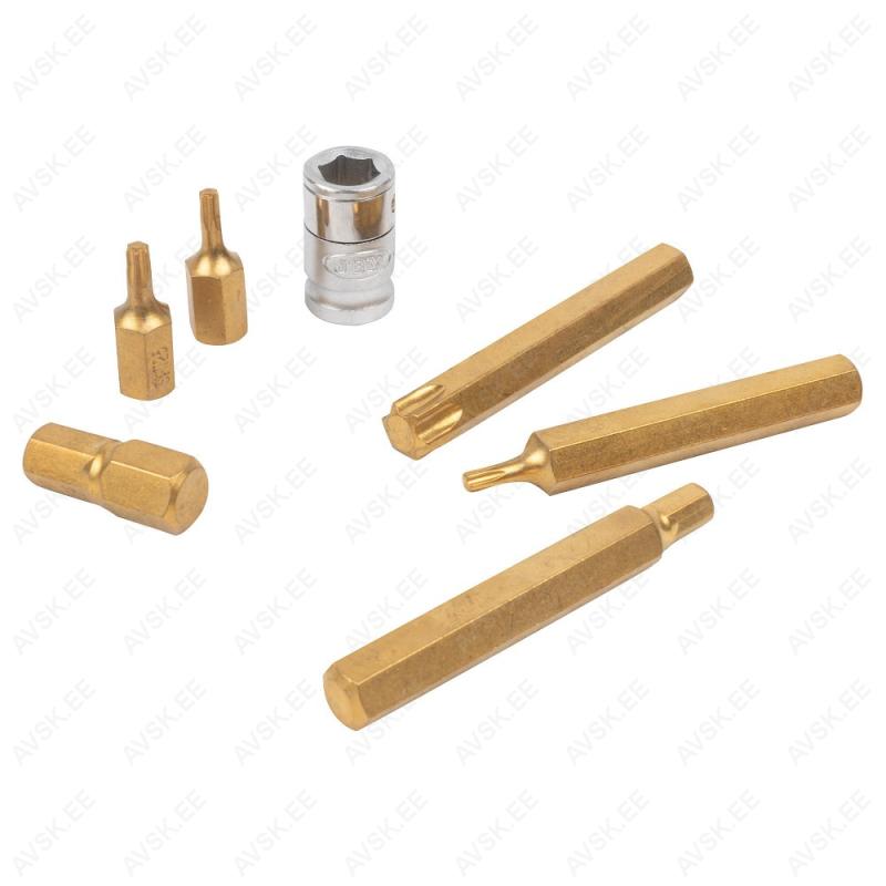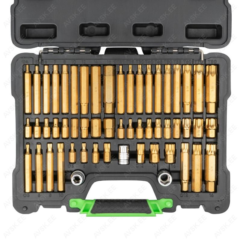 JBM valiku kõige tugevamad otsikud ja kõige katvama valikuga komplekt. Valmistatud S2 eriterasest. Spetsiaalse kuldse galvaanilise töötlusega. Komplektis pikad ja lühikesed otsikud. Kuuskant. Torx. 12-tähik. 30 mm ja 75 mm pikkused. Plastkohvris.