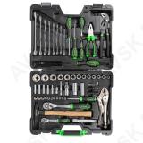 Ideaalne kodukasutusse. Sisaldab enamlevinud padruneid. silmus-lehtvõtmeid. otsikuid. kruvikeerajaid. näpitsaid ja vasarat. Siidmatt pinnatöötlus. Tugev plastkohver. metallist lukustitega.