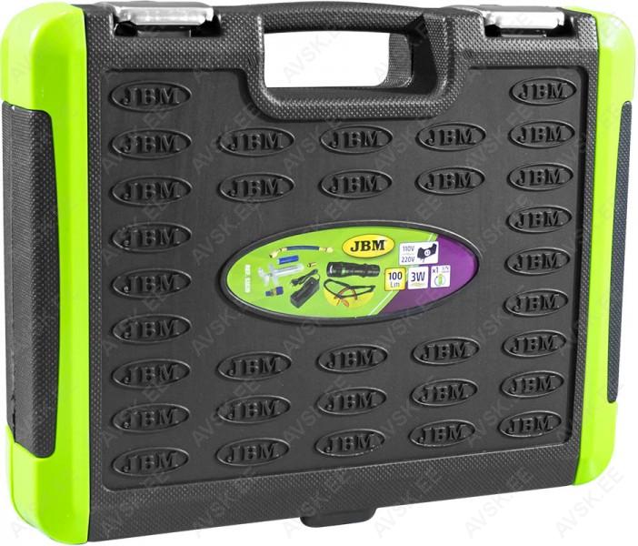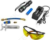 Auto kliimasüsteemi lekete tuvastamise komplekt. Komplekti abil saab tuvastada lekke UV-aine abil (ei ole komplektis kaasas - telli eraldi 12977J). Komplektis UV-lamp. UV-prillid. täitepump koos voolikute ja adapteriga. akulaadija lambi aku laadimiseks. Plastkohvris.
