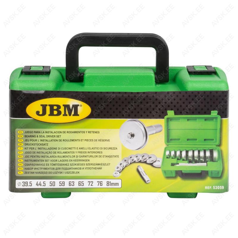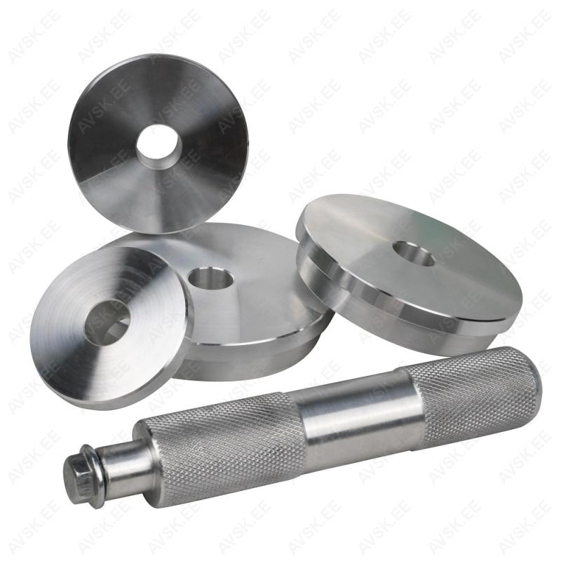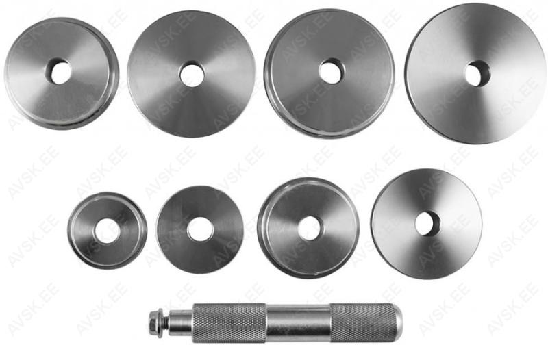 Pressimise ketaste komplekt. Äravõetava käepidemega. Kasutatakse laagrite. tihendite. pukside pressimisel. Komplektis läbimõõdud 39.5-44.5-50-59-63-65-72-76-81mm. Tugevas plastkohvris.