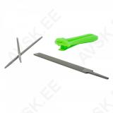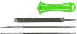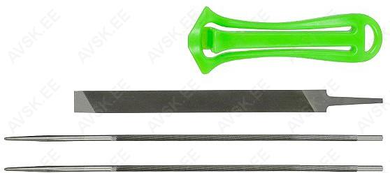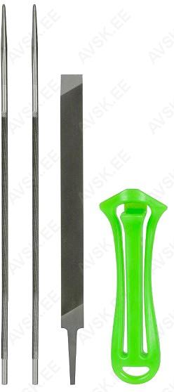 Vahetatava tööosaga. Komplektis kaks ketiviili ja lapikviil. Lapikviili pikkus 190 mm. ümarviilide pikkus 245 mm. läbimõõt 4 mm.