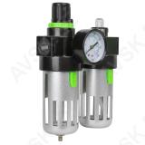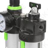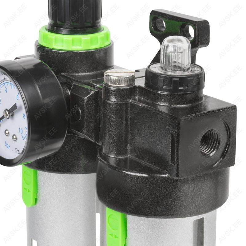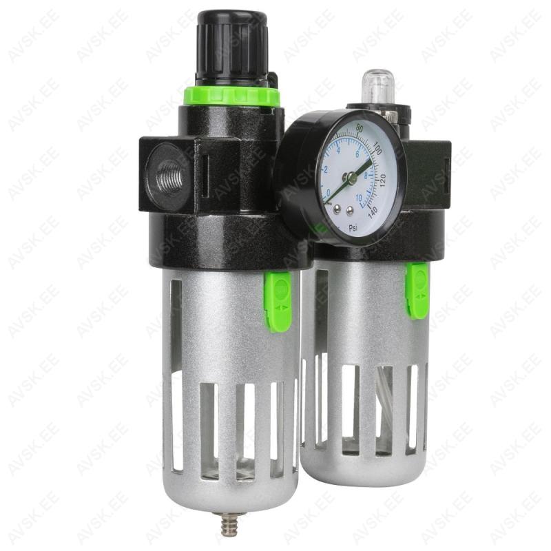 Filter-regulaator + automaatõlitaja suruõhutööriistale. trassiõhule kasutamiseks. Alumiiniumist korpus. polükarbonaadist kogumisanum 150 ml filtreerimiseks ja teine kogumisanum tööriistaõlile. Mõlemad anumad kaitstud alumiiniumkattega. Rõhumanomeetriga. Max töörõhk 9.5 bar. reguleerimisvahemik 0.5-8.5 bar (NB! suruõhutööriistadel soovitame 6.3 bar). 1/4" keermega liideseavad. Seinakinnitus avad.