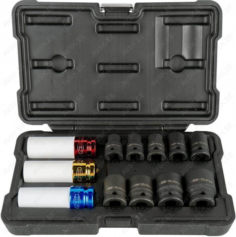 Komplektis mõõdud: 27, 29, 30, 32, 33, 34, 35, 36, 38, 41, 43, 46, 48, 50 mm Mõõdud: 66 mm / 6k, 74 & 76 mm / 15k, 76 mm / 8k, 76 mm / 12k, 76 mm / 14k, 86 mm / 16k, 86 mm / 18k, 92 mm / 10k, 93 mm / 15k, 93 mm / 45k, 96 mm / 18k, 106mm / 15k, 108 mm / 15k, 108 mm / 18k ja kolmijalka-avain 65-120mm. Adapteri 3/8" - 1/2". Mõõdud: 6, 7, 8, 9, 10, 11, 12, 13, 14, 15 16, 17, 18, 19, 20, 21, 22, 23, 24 mm Avainten räikkäpäät on varustettu innovatiivisilla tartuinkynsillä, jotka pystyvät tarrautumaan vielä jopa 85 prosenttisesti pyöristyneeseen pultinkantaan.Sisältää avainkoot 8, 9, 10, 11, 12, 13, 14, 15, 16, 17, 18, 19 mm Tööriistad asuvad pehmetes "EVA"-paneelides. Paneelide pesa on teist värvi, mis aitab märgata puuduva tööriista kuju. 15-Osainen sarja sisältää erikoislyhyet kiintolenkkiavaimet:- 8, 9, 10, 11, 12, 13, 14, 15, 16, 17, 18, 19, 20, 21, 22 mm Tööriistad asuvad pehmetes "EVA"-paneelides. Paneelide pesa on teist värvi, mis aitab märgata puuduva tööriista kuju. 21-Osainen XZN-hylsysarja sisältää:- 50 mm pitkät M5, M6, M8, M9, M10, M12- 95 mm pitkät M5, M6, M8, M9, M10, M12- 135 mm pitkät M5, M6, M8, M9, M10, M12- 195 mm pitkät M8, M10, M12 Tööriistad asuvad pehmetes "EVA"-paneelides. Paneelide pesa on teist värvi, mis aitab märgata puuduva tööriista kuju. 24-Osainen kuusiokolohylsysarja sisältää: - 50 mm pitkät 5, 6, 7, 8, 10, 12 mm- 95 mm pitkät 5, 6, 7, 8, 10, 12 mm- 135 mm pitkät 5, 6, 7, 8, 10, 12 mm- 195 mm pitkät 5, 6, 7, 8, 10, 12 mm Tööriistad asuvad pehmetes "EVA"-paneelides. Paneelide pesa on teist värvi, mis aitab märgata puuduva tööriista kuju. 24-Osainen Torx-hylsysarja 3/8" vääntiölla sisältää:- 50 mm pitkät T20, T25, T27, T30, T40, T45, T50, T55- 95 mm pitkät T20, T25, T27, T30, T40, T45, T50, T55- 135 mm pitkät T40, T45, T50, T55- 195 mm pitkät T40, T45, T50, T55 Alumiiniumkarkassil, alumiiniumkattega külgedega tööriistakast koos volditava põhjaga, lukustatav spetsifikatsioon: 1 lõikenuga 155 mm, tera 18 mm 10 varutera, 18 mm 1 universaalne mutrivõti, 200 mm 1 veepumbatangid , 250 mm 1 tangid, 175 mm 1 "telefoni" tangid, 200 mm 1 vesilood, 230 mm 1 mõõdulint, 15 mm x 3 m 1 reveresiga knarre 6.3 mm (1/4"), 72 teeth 1 pikendus, sise/välis mõõt 6....