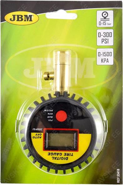 Tugev ja täpne metallist rehvirõhu manomeeter. millel LCD displei. Mõõtevahemik 0-15 bar. võimalik valida erinevate mõõteühikute vahel (PSI. BAR. KPa. KG/CM). Automaatne väljalülitus. juhul kui ei ole kasutatud.
