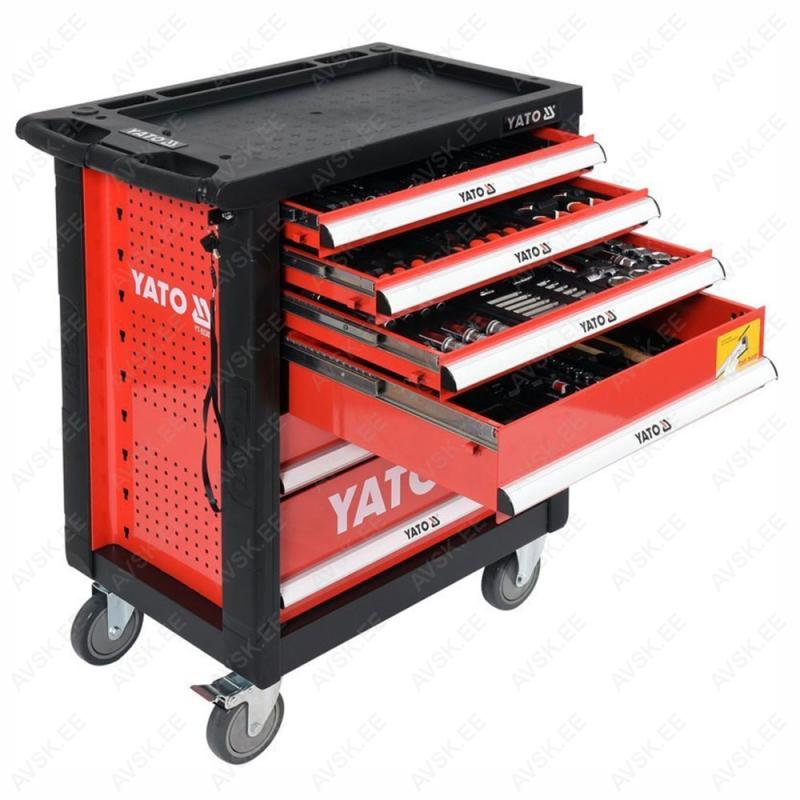 The YATO service cabinet (YT-55307) is a professional roller cabinet for organized storage and easy mobility. It features 6 spacious drawers running on ball-bearing slides. The top three drawers have a 25 kg load capacity, while the bottom three support up to 35 kg. A convenient side handle and durable rubber wheels (one braked) make maneuvering effortless. The non-slip worktop allows you to work directly on the cabinet. The double-wall steel body, corner bumpers, and universal perforation deliver durability and upgradeability.