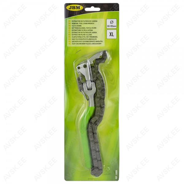 Tugev ja võimas topeltketiga. käepidemega filtrivõti. Võti on mõeldud suure läbimõõduga õli-. kütuse-. hüdraulika- ja separaatori filtrite eemaldamiseks. Ohutult ja turvaliselt. kuna kett ei libise filtripinnal ja mida tugevamat jõudu võtmega rakendada. seda tugevamaks muutub ka keti haare. Filtritele läbimõõduga 60-195 mm. Plastkattega pidemeosa.